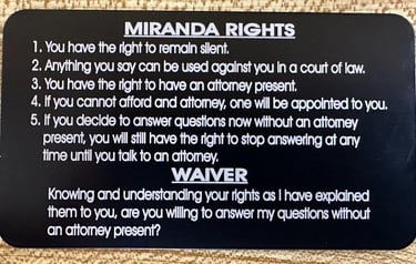 Experience the durability and elegance of our laser-engraved anodized aluminum Miranda Warning pocket cards measuring 2" x 3.5". This premium material is designed to resist corrosion and tarnishing, ensuring a long-lasting product that maintains its stunning appearance. Fully customizable!