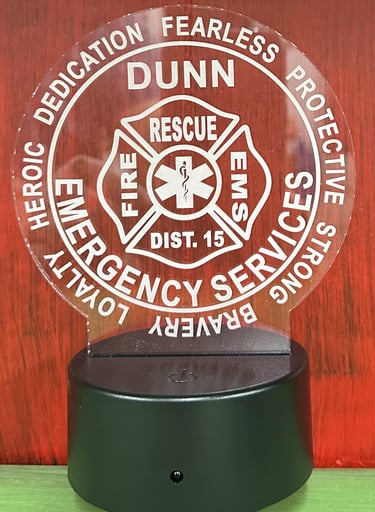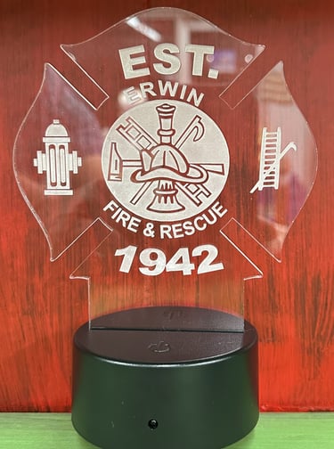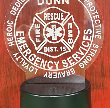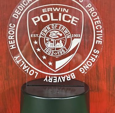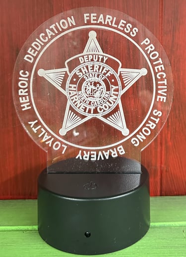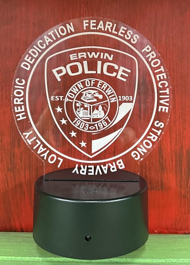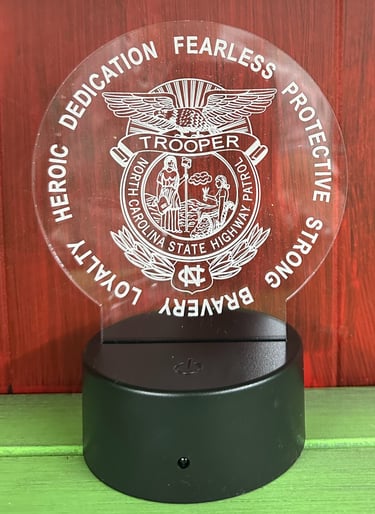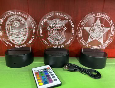 Our unique LED base lights make the perfect gift and are a great addition to any office or home decor. They can be powered by three AA batteries or the included USB cable, allowing you to connect them to any charging source, including your computer. The included remote control allows you to choose from 16 colors, four modes, and adjust the brightness, making it suitable for use as a night light. 7 inches tall. Priced at $25. $30 w/ personalization which can include 3 lines of text.
